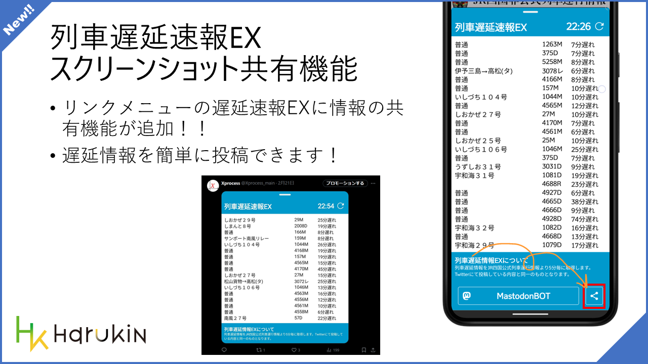 遅延速報 EX の画面をスクショする機能です。Twitter 等に共有するときに便利になりました。この機能をベースとして、今後もスクショ系の機能は追加していく予定です。最新の情報をみんなで共有しよう!