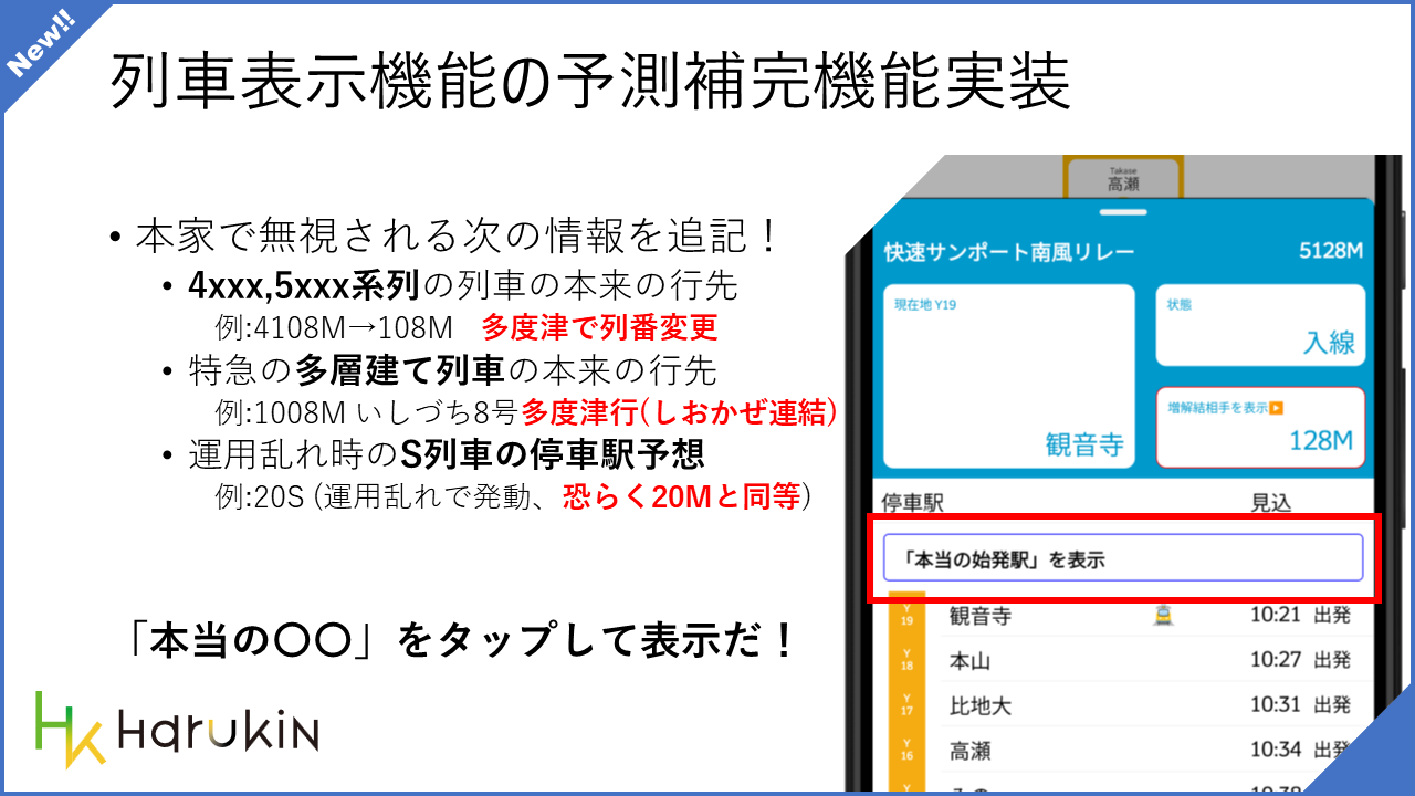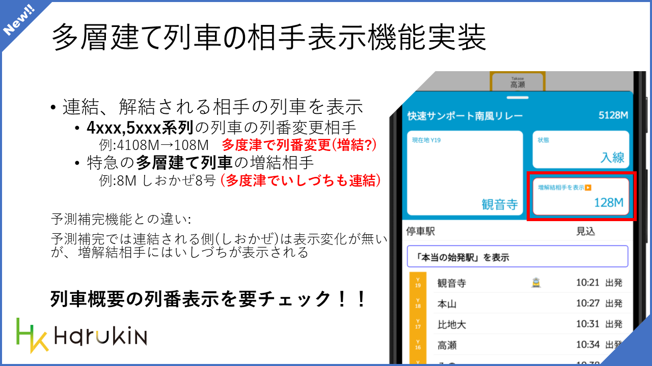 一部の列車が公式に反映されていない行先を推測する機能が実装されました。予讃線や高徳線で見受けられる、ワンマン列車への変化系や、分割する特急列車のような途中で列車番号が変更される運用のその先を表示します。運用乱れ時に時折発生する、S 列番の本来の列番を検索し、そのダイヤを表示することができるようになりました。運用のチェックにご利用ください。