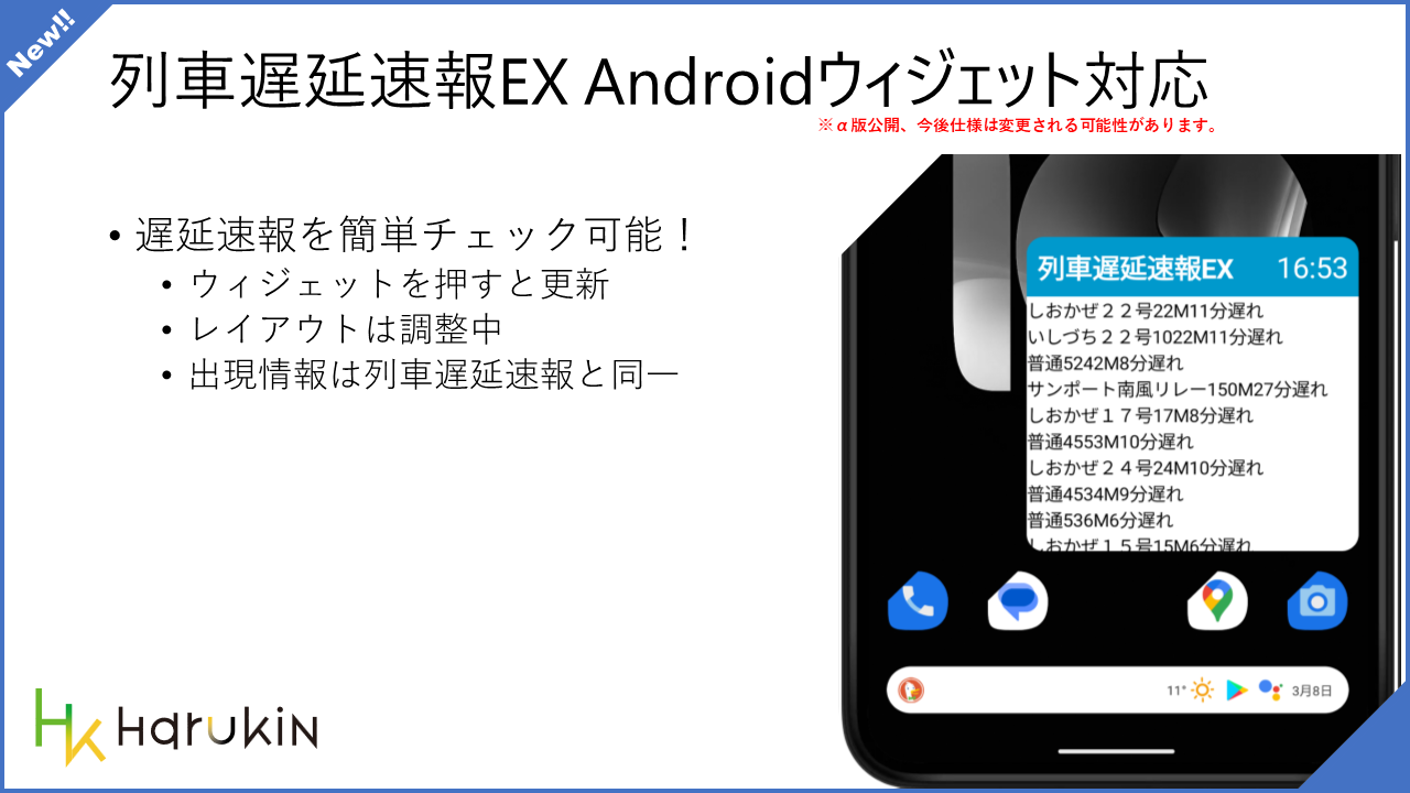 Android のホームアプリ向け列車遅延速報 EX のウィジェットを作成しました。皆さんのホームアプリから自由に設置可能です。