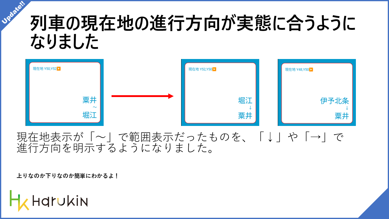 • 列車がどっち方向に走ってるのかがちゃんとわかるようになりました。現在地表記により意味をもたせられるようになりましたね。