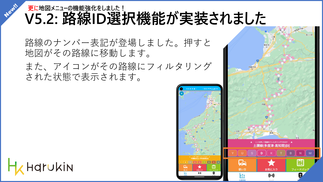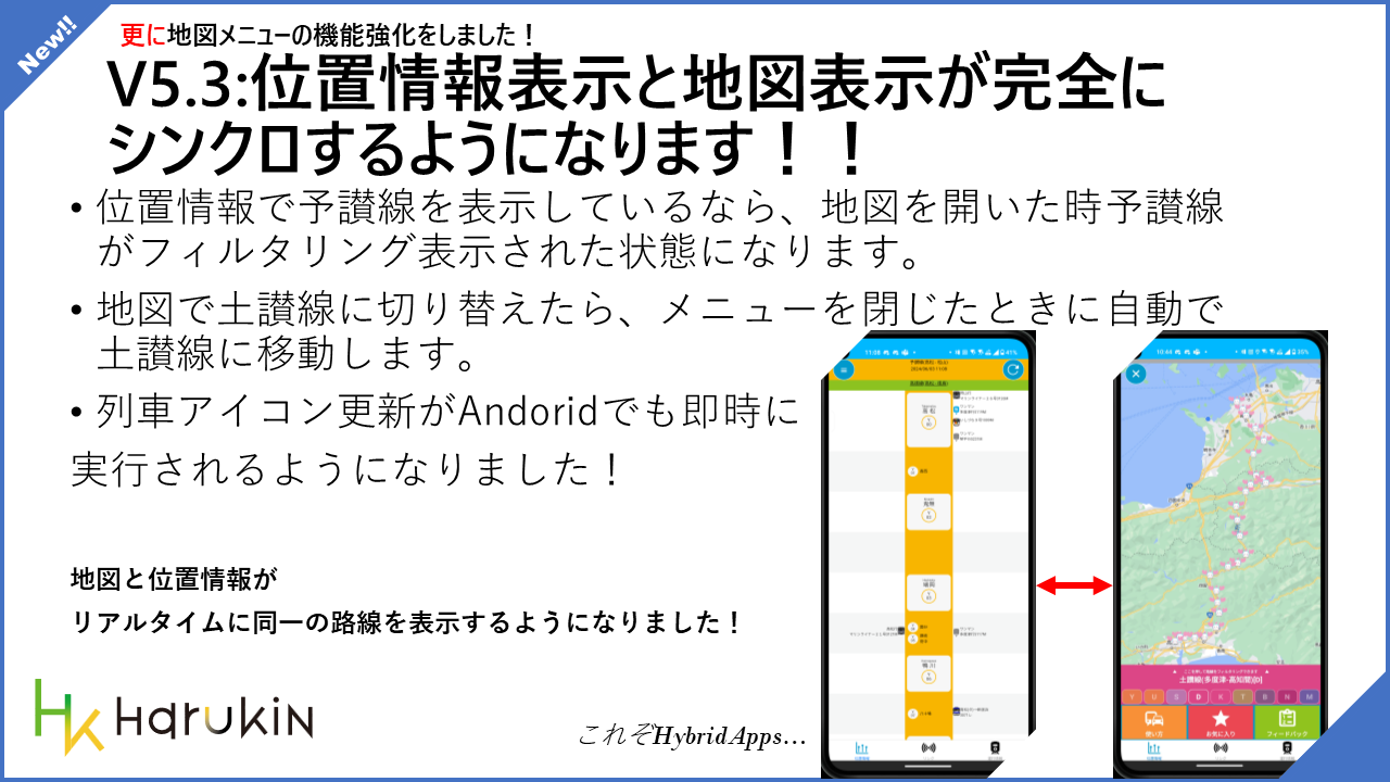 • 位置情報と地図選択が完全にシンクロするようになります。それぞれ路線を切り替えたらそれぞれの画面に反映されます。また、Android でも路線のアイコンが即時反映されるようになりました。