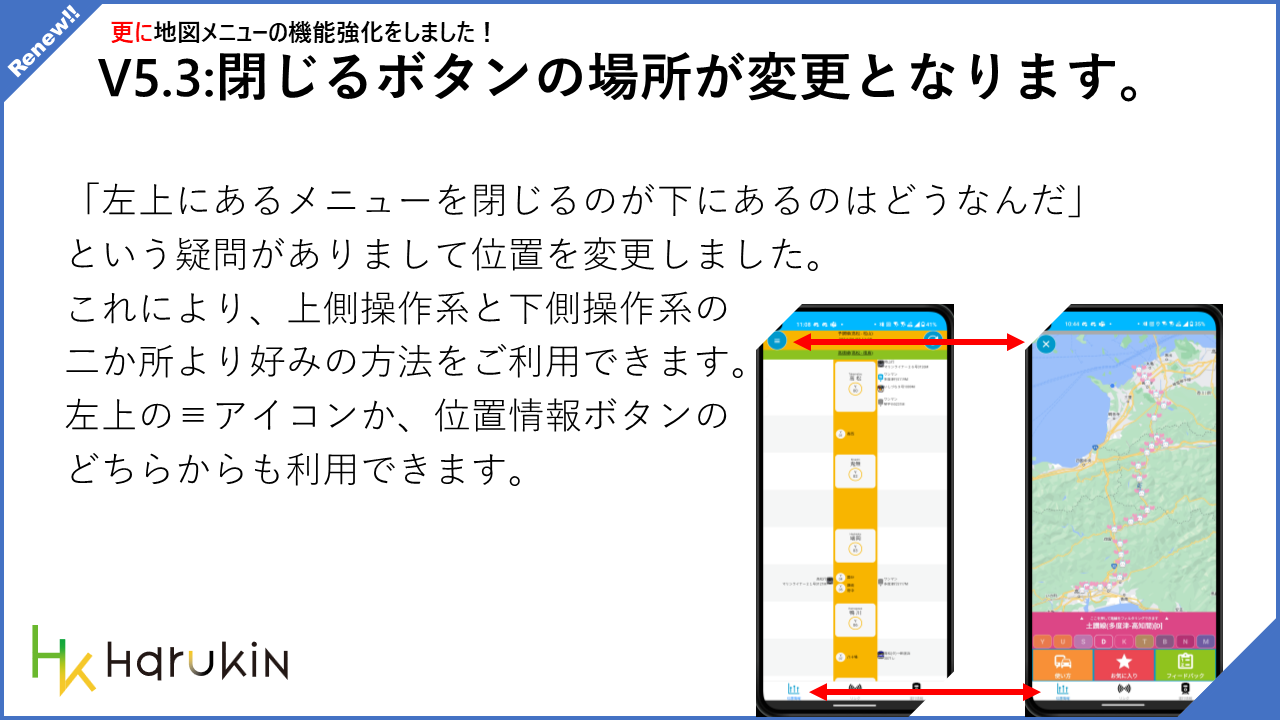 • 閉じるボタンの位置が変更になります。下で閉じたい場合は位置情報タブを押して閉じてください。