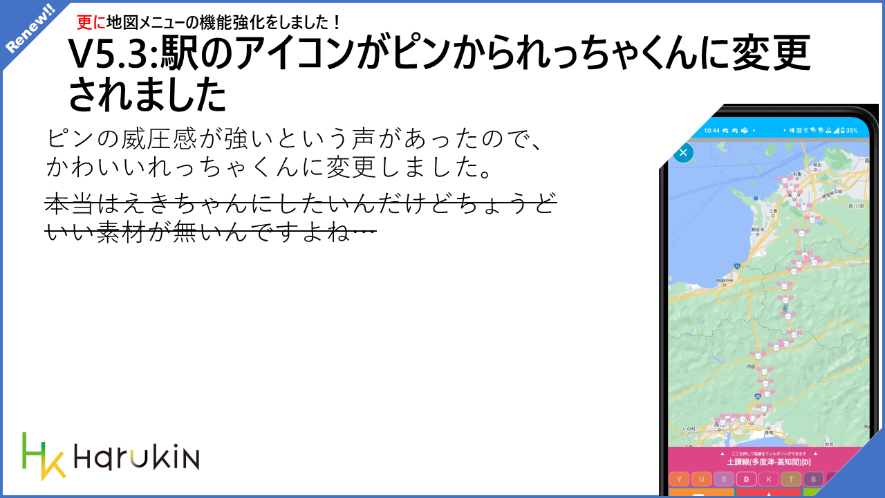 • 駅のアイコンがれっちゃくんに変更。かわいいけど本当はえきちゃんがいいんだよなぁ…
