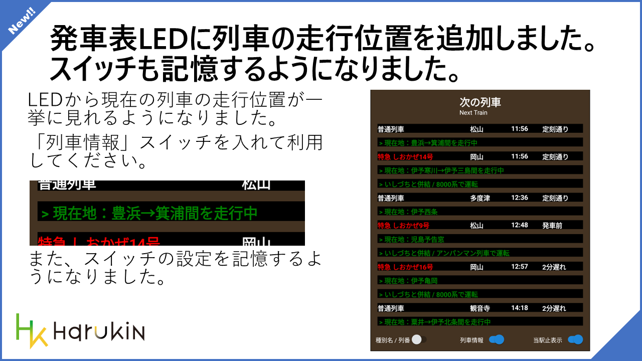 • 発車表 LED に走行位置を追加しました。JR 西日本みたいな「前の駅」みたいな概念を将来的につくりたいです。