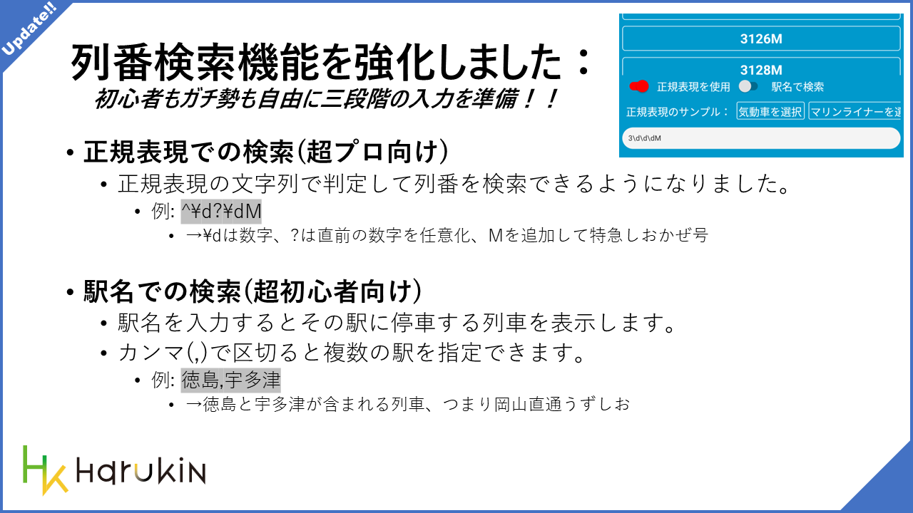 上級者向けツールにある、列番検索機能に新しく正規表現を使用した検索機能と駅名でフィルタリングする検索機能が追加されました。これで列番「を」調べるような使い方もできるようになります!