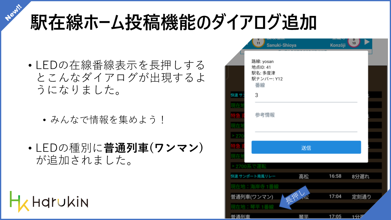 前回のアプデで登場した在線ホーム機能に投稿できるダイアログが新登場しました!LED表示の現在地を長押しすると、投稿ダイアログが出現しますのでみんなで列車が入線している番線を調査しよう!