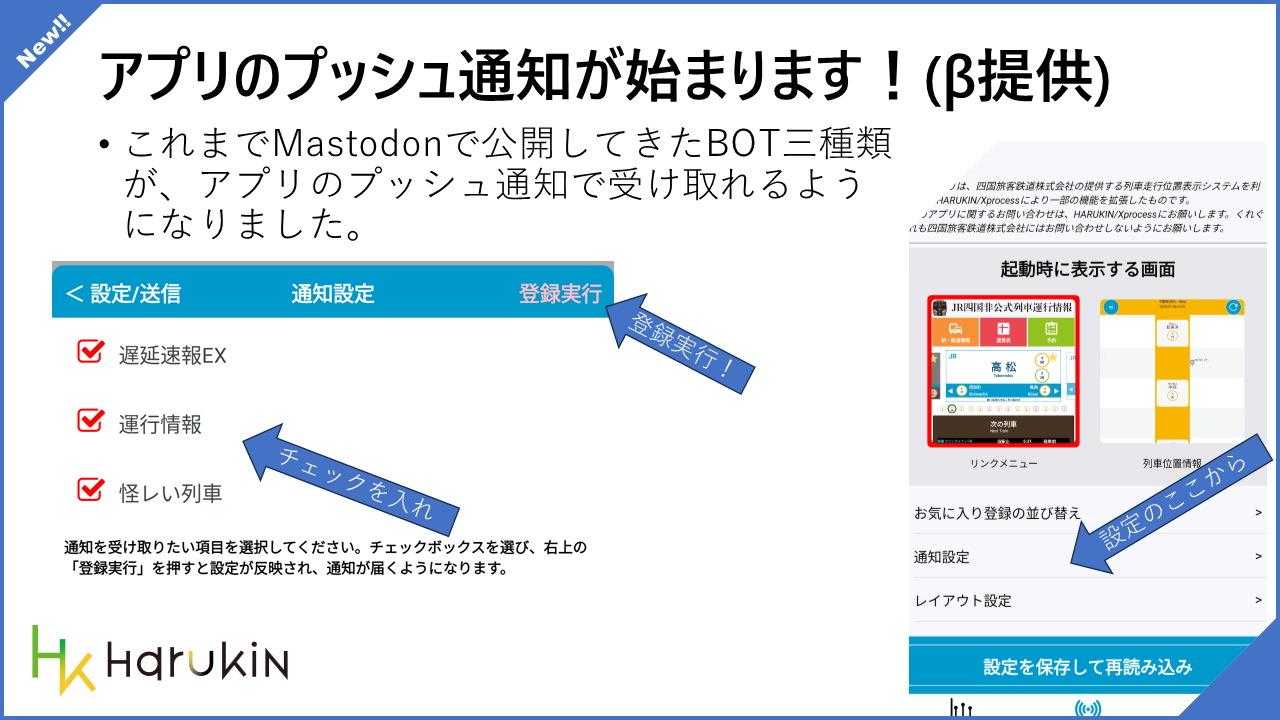 既に起動時に通知の権限が要求されたと思いますが、この度、通知機能が利用可能になりました。通知の権限を許可した上で、設定画面の「通知設定」から取得したいBOTのデータを選択するとプッシュ通知が届くようになります。MastodonのBOTを見たらわかりますが、5分毎に動くので相応にうるさいと思いますので必要に応じて設定を調整してご利用ください。