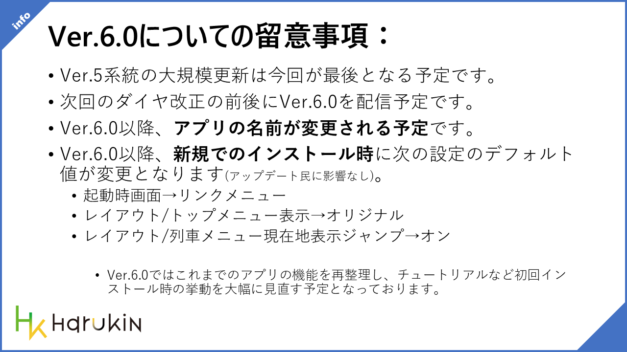 Ver.5系統の大規模更新はこれが最後になる予定です。次回の大規模アップデートはVer.6.0を予定しておりますが、次の変更が予定されております。