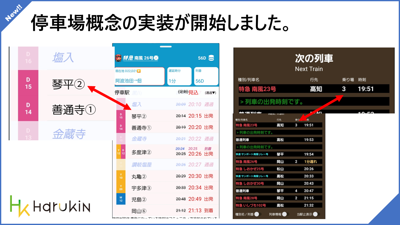 2. 列車情報ページも変化し、列車の現在地アイコンの位置が変更されたのち停車乗り場情報が駅名の右に表示されるようになります。